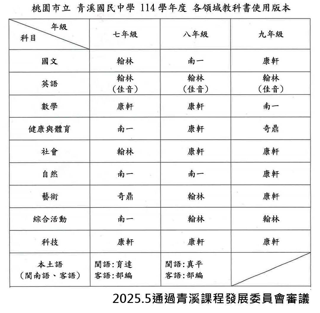 開啟上方區塊 最新公告-教務處新聞:桃園市立青溪國民中學114學年度各領域教科書使用版本-桃園市立青溪國民中學-卓越創新 選擇觀看內容 最新公告資訊內容網站連結網站FAQ會議記錄 最新公告 / 內容類型:新聞類型 最新公告首頁 教務處新聞 瀏覽:2327 搜尋 選擇最新公告分類 處室新聞校園新聞防疫公告學生家長教師專區政令宣導競賽活動性平專區 送出 桃園市立青溪國民中學114學年度各領域教科書使用版本 發佈者:設備組長 / 發佈時間:2025-05-22 / 內容狀態:啟用中 處室新聞 教務處新聞 學務處新聞 總務處新聞 輔導室新聞 人事室新聞 會計室新聞 夜補校新聞 幼兒園新聞 家長會新聞 內容標籤 資訊 39宣導 60報名 45學習 32課程 17緊急 5特色 1研習 125公告 394比賽 143重要 67注意 27節日 2防疫 5活動 76教學 6升學 52 頁面QRcode 轉知 11月「3D空間魔法師,打造創意設計實作研習」,透過兩週4小時實作課程,提升教師3D設計能力及跨領域課程整合力,鼓勵教師踴躍報名參加 轉知 客家委員會辦理「客家影像故事」徵件活動 轉知 國立臺北藝術大學師資培育中心謹訂於114年11月21日(星期五)辦理114年「數位科技與人工智慧應用創新教學」學術研討會,鼓勵教師踴躍報名參加 轉知 國立師範大學成癮防制碩士在職學位學程115學年度招生相關訊息 敬邀教師參加「科技教育實務線上研習會」 轉知 財團法人金車文教基金會「SDGs過程戲劇體驗工作坊(線上)」活動資訊 觀看更多內容 內文可瀏覽群組: 註冊會員 訪客 內容附件下載 Download attachment 114學年度青溪國中教科書版本 檔案下載 最新公告-相關內容 related information 「114年度教師諮商輔導支持服務」3-6月教師線上研習課程與上半年度實體工作坊 總館4月辦理之閱讀推廣活動,鼓勵所屬同仁及學生踴躍參加。 《咱的歌:台語囡仔歌創作專輯》 轉知教育部國民及學前教育署補助財團法人台灣設計研究院辦理「第二屆教科圖書設計獎─SEE DIFFERENT 教科圖書設計展」事宜 教育部國民及學前教育署(以下簡稱國教署)114學年度徵聘商借教師辦理技職教育或雙語教育相關業務案 國立中央大學辦理「因材網自然科學2025國中小暑期線上課程」活動簡章及文宣海報一案 113年度科學教育區域重點學校計畫(生活與應用科技(一)機電與資訊類)教師增能研習 114年度「『文化資產與公民參與』講習與世界咖啡館」活動簡章1份 國立臺灣師範大學(以下簡稱臺師大)數學教育中心辦理「第三期數學活動師培訓研習工作坊-臺北場」一案 「2024聯合國永續發展與STEAM科學夏令營」 轉知 親子天下翻轉教育發布之「國中班級經營 X 高效教學資源專區」網站,供教師運用 國立臺中教育大學辦理「職前與在職教師AIPACK課程推動與教學能力提升計畫」之「數學領域AIPACK推廣工作坊」實施計畫 偏遠地區及非山非市學校北區整合性計畫教 師 培力增能研習:客家傳統竹編工藝 轉知 桃園市114年度友善校園學生事務與輔導工作--高中、國中及國小學校性別平等教育議題融入教學教案設計甄選活動實施計畫,鼓勵教師踴躍參加。 114年「素養導向課室評量資源建置暨推廣計畫」線上專題講座研習資訊 ←前往上一頁 前往下一頁→
